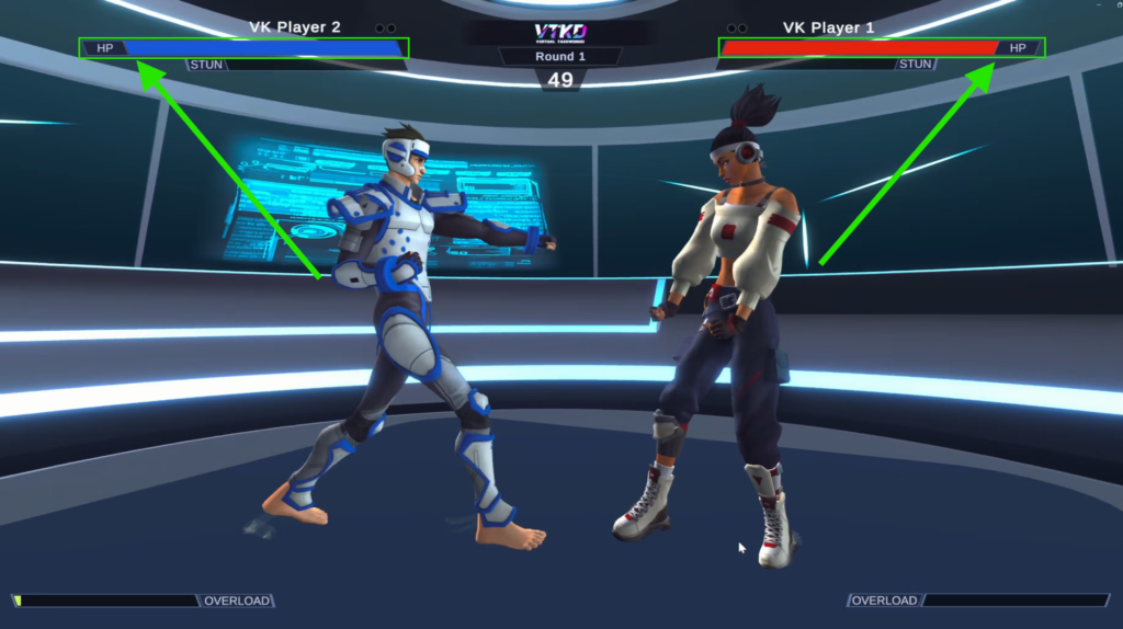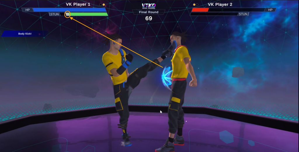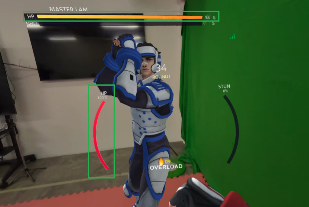 In the player’s VR view, the opponent’s health is shown above the opponent, while the player’s own health is displayed on the left side of the screen. The Health Bar decreases whenever the opponent successfully lands a strike on the body or head.