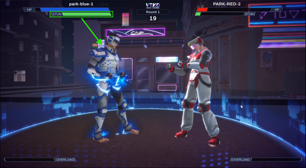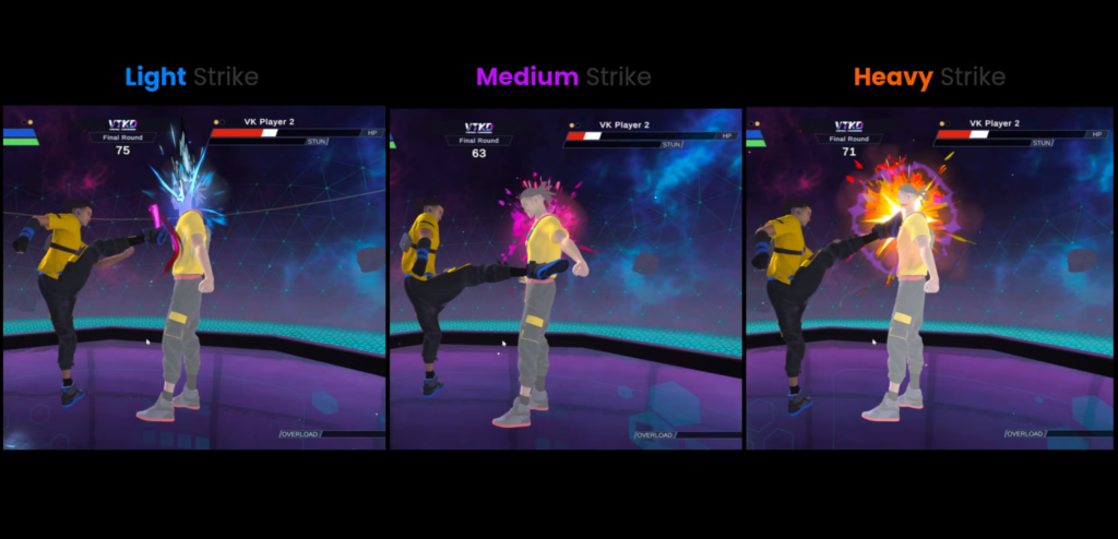 Defending mechanics in VTKD. Players can block an opponent’s attack by bringing the forearm close to the body, raising the knee or combine both actions for enhanced defense. When a block is successful, players receive both visual and audio feedback.