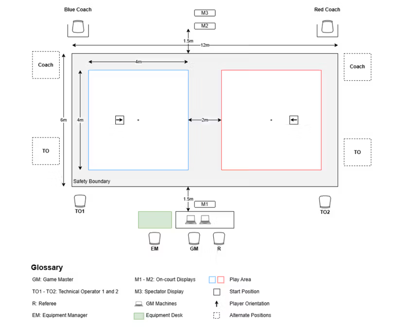 The size of each individual’s play area is 4m by 4m and the distance apart from each player must have a minimum of 2 mats (WT approved mats 0.8m or 1m).
