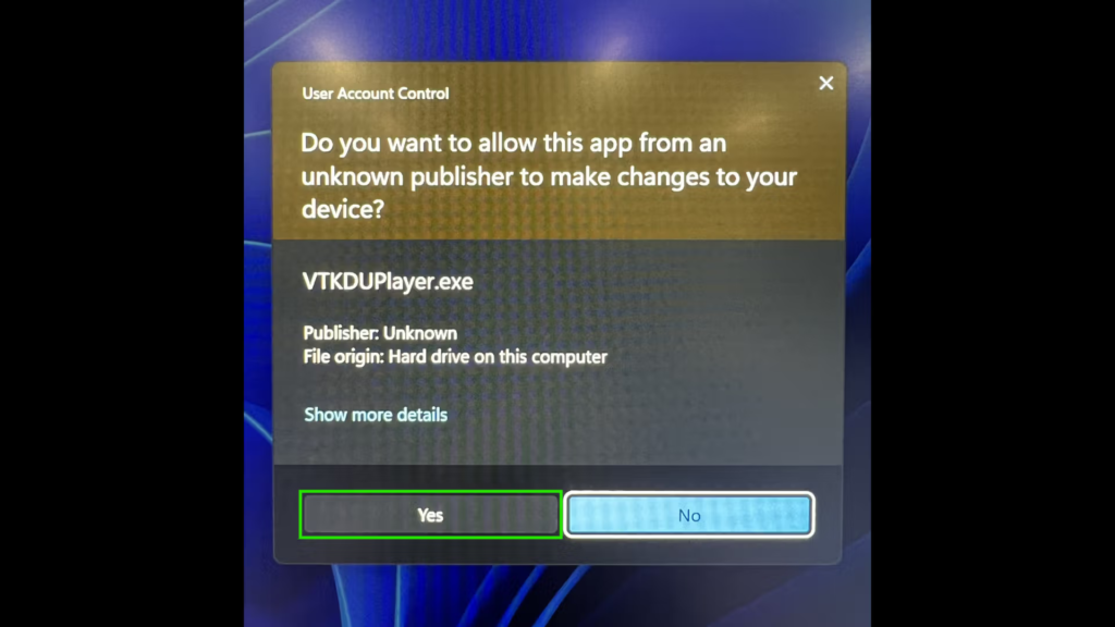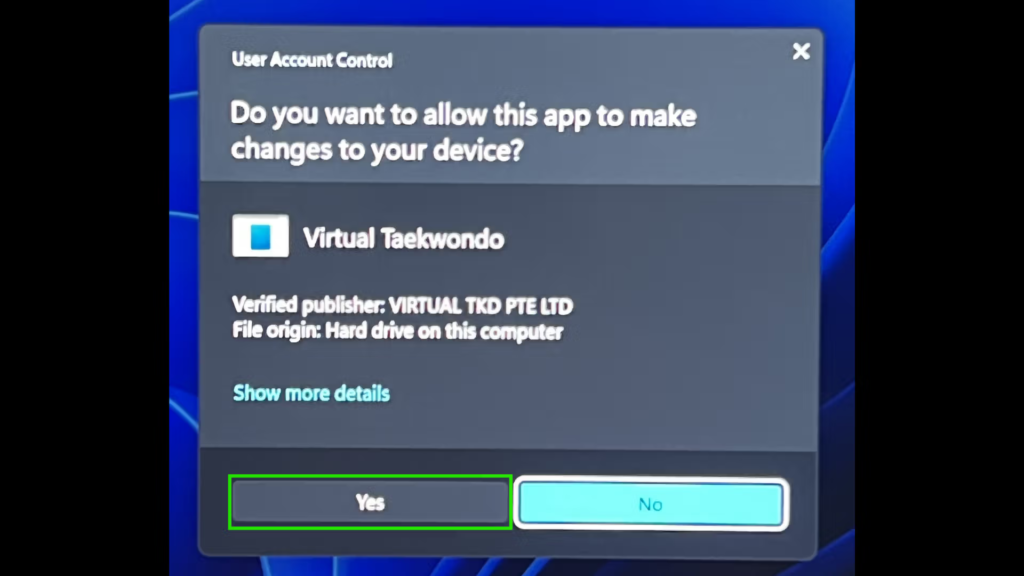 - Click ‘Yes’ to allow the User Access Control pop up.