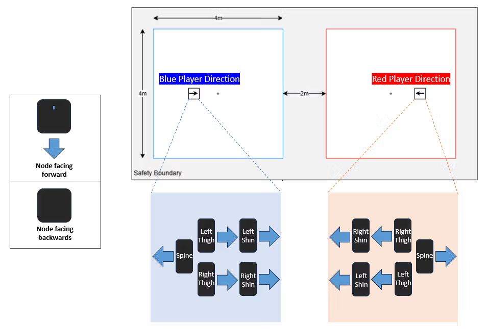 - Place your motion trackers on the Player’s start point in the Field of Play, simulating the direction that the player will be facing (Refer to image for Players direction example).