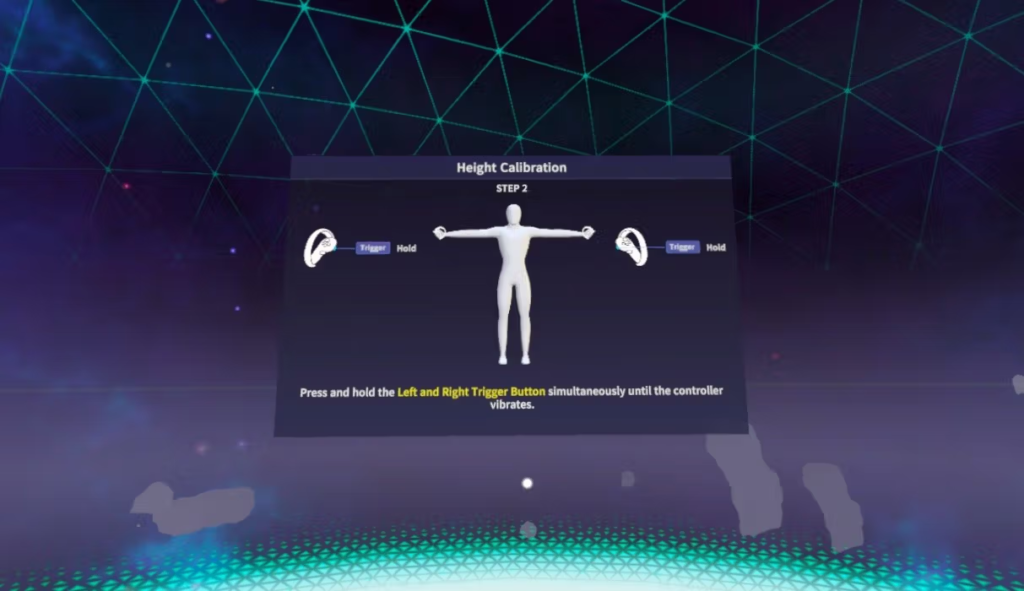 Legacy Calibration refers to the in-game calibration method used in the waiting room in VTKD V1.2.33, before Surface Calibration was introduced in VTKD V1.2.34. In V1.2.33, Legacy Calibration was performed by having the player wear all nodes, stand in a T-pose facing forward, then press and hold both controller triggers until vibration is felt (about 2 seconds).