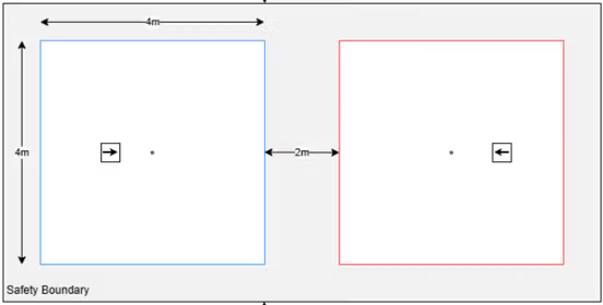 If a player steps outside the shrinking boundary, they are penalised with a health deduction of 100 to 150 health points. Health continues to be deducted each second the player is outside of the shrinking boundary, until the player either steps back within the boundary, or makes contact with the opponent which resets the boundary to its original size. This function encourages continuous engagement between players.