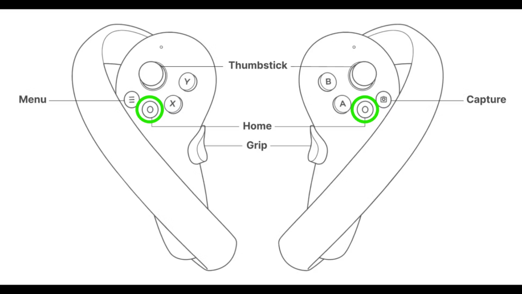 2. Recenter VR view by looking forward and then holding on to the ‘Home’ button on either controller for 2 seconds.