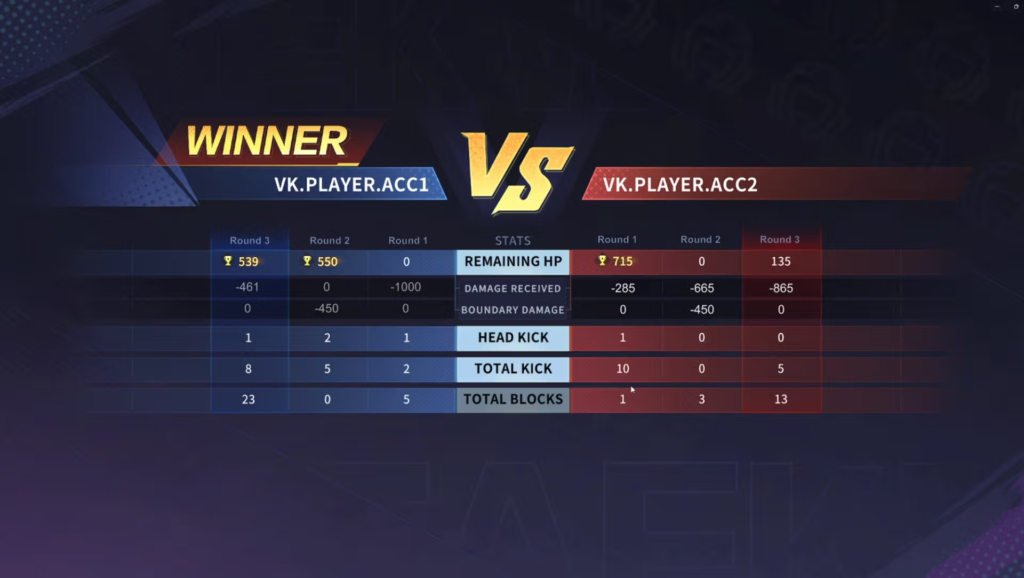 Round 1: Both players have the same HP, a player wins due to fewer total kicks.