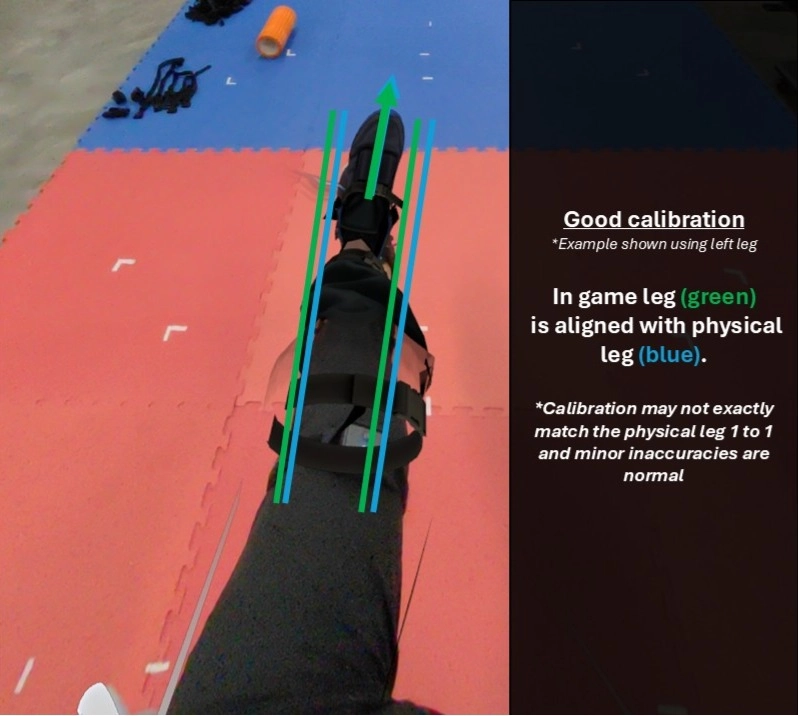 - After calibration, the avatar legs match your real legs in stance and facing direction.